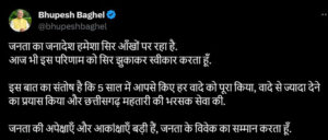 रायपुर। छत्तीसगढ़ के मुख्यमंत्री भूपेश बघेल ने चुनाव परिणामों के आगे हार को स्वीकार करते हुए राजभवन में देर रात इस्तीफा सौंपा। सोशल मीडिया पर अपनी प्रतिक्रिया देते हुए उन्होंने लिखा, “जनता की आशाएं और मांगें हमारे लिए महत्वपूर्ण हैं, और मैं उनकी समझ और समर्थन के लिए कृतज्ञ हूं। हमने 5 सालों में जनता के लिए काम किया है और हर वादा पूरा किया है। जनता के विवेक का सम्मान करता हूं।”
